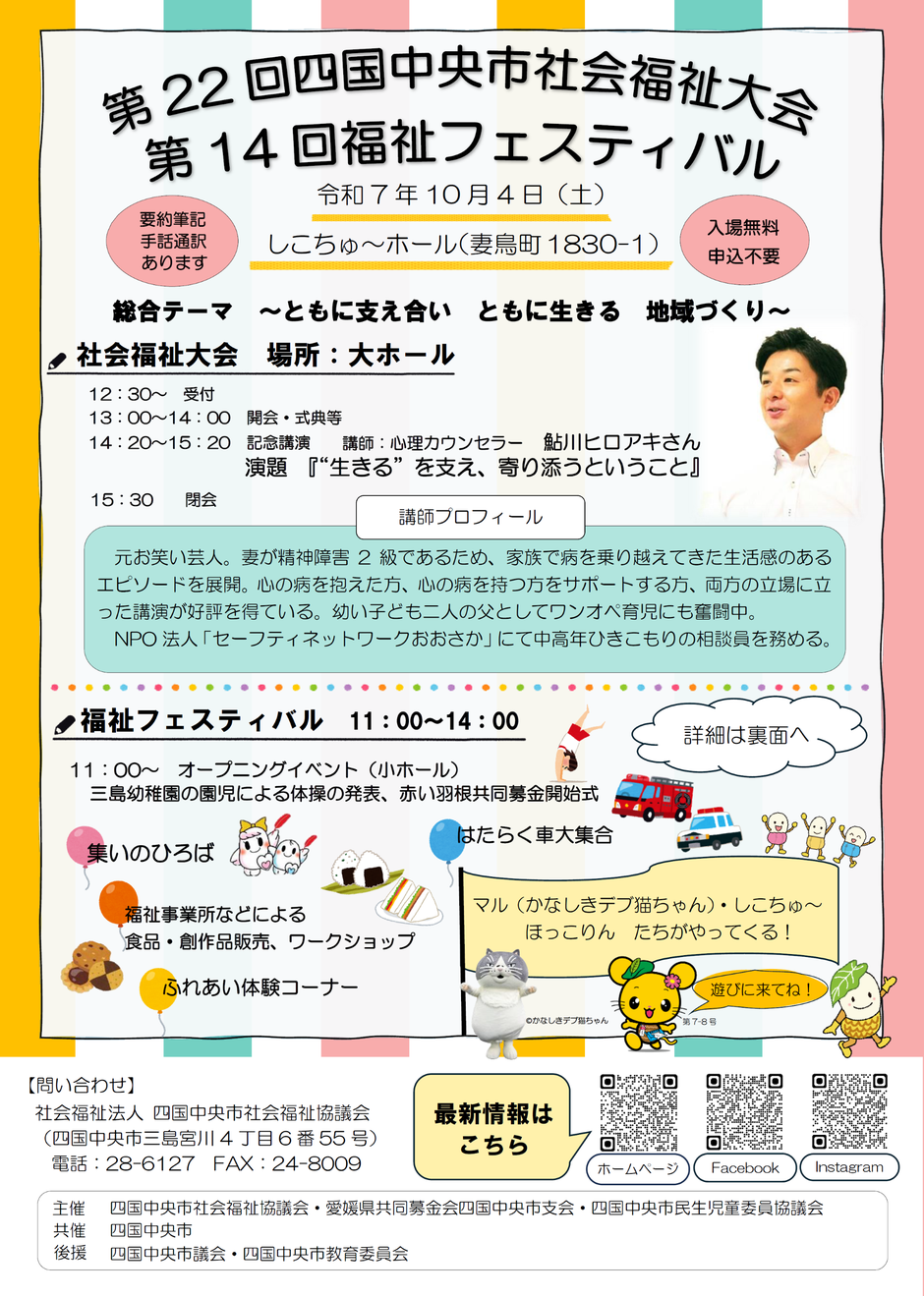 ◆社会福祉大会 ●12:30 受付 ●13:00~14:00 式典 (社会福祉の向上に功労・善行のあった方の表彰) ●14:20~15:20 記念講演 演題:『“生きる”を支え、寄り添うということ』 講師:鮎川 ヒロアキさん(心理カウンセラー) ●15:30 閉会