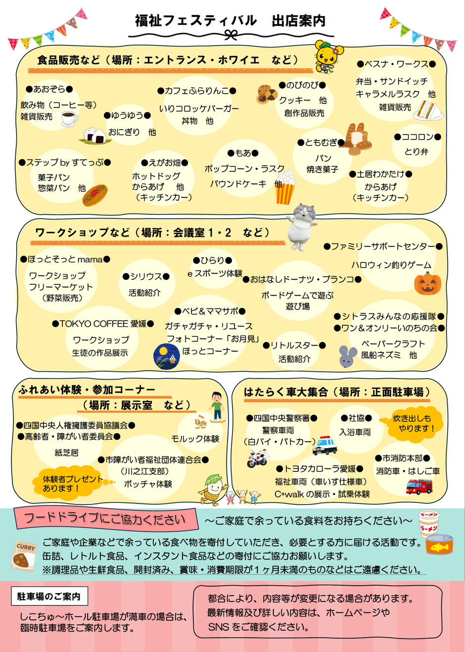 ◆福祉フェスティバル(11:00~14:00) ●オープニング・三島幼稚園園児による体操の発表 ●赤い羽根共同募金運動 ●福祉関係事業所による食品・創作品販売やワークショップ ●はたらく車大集合(消防車両や警察車両、福祉車両の展示) ●ふれあい体験コーナー(ボッチャ、モルックなど) |