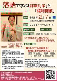 チラシ裏面の参加申込書に必要事項を記入の上、社会福祉協議会本所 または支所までご持参いただくか、電話またはFAXでお申し込みください。 チラシ裏面に掲載のQRコードからもお申込みいただけます。 |